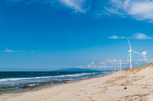 村松浜海水浴場は、新潟県胎内市にある海水浴場です。日本海に面し、青い海と白い砂浜が美しい景観で知られています。また、間近に風力発電の風車が立ち並び、迫力のある景観を楽しむことができます。